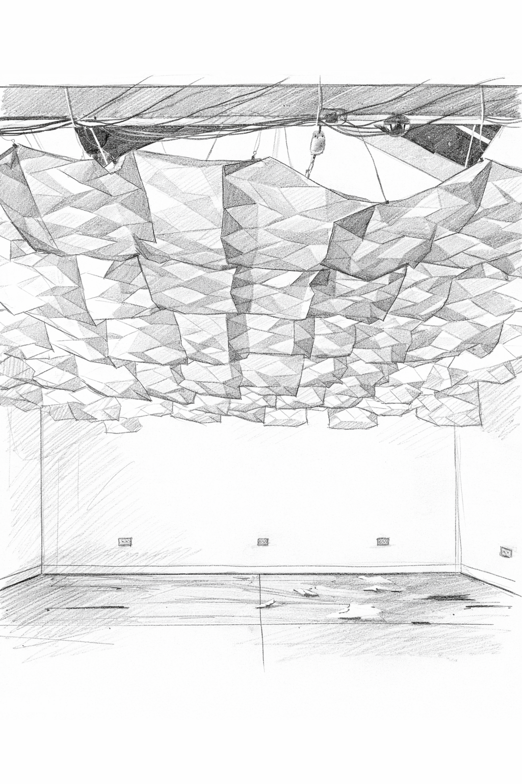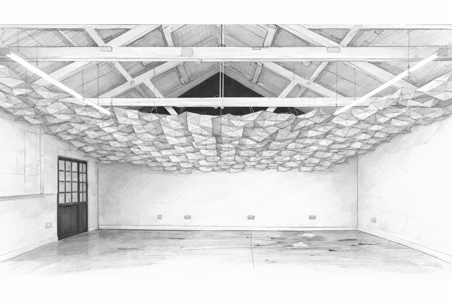I drew on references that explored how sculptural forms can shape atmosphere rather than simply decorate a space. The decision to create an origami ceiling came from a desire to work with light as a material in its own right, using folded paper to soften, diffuse and redirect colour throughout the room.